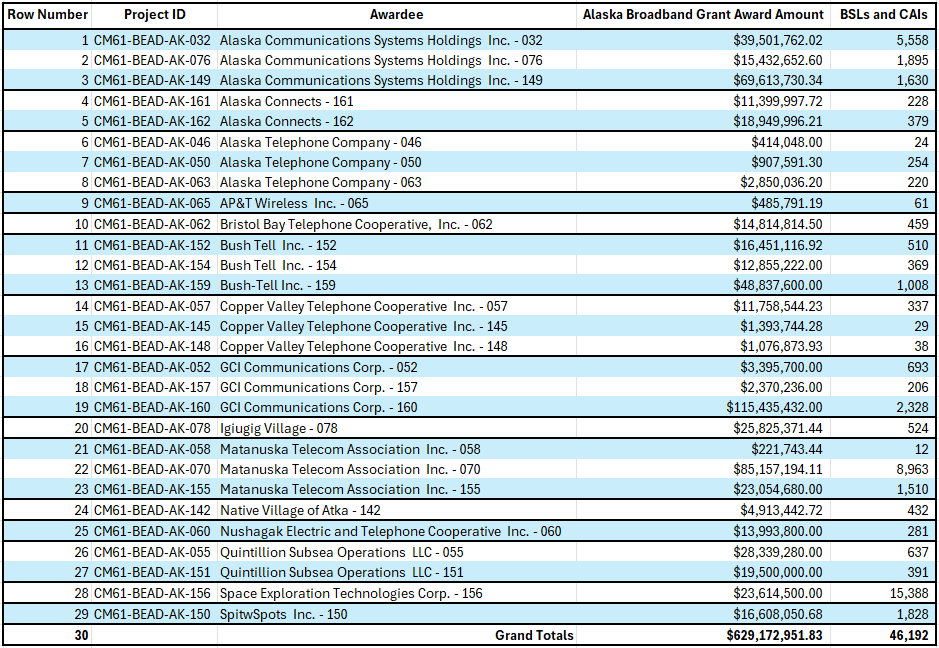 Alaska Broadband Office The Alaska Broadband Office (ABO) was created on August 9, 2022, when Governor Dunleavy signed Alaska House Bill 363 into law. The State of Alaska had been engaged in broadband work for several years, most recently highlighted through efforts of the Governor’s Task Force on Broadband in their Final Report issued in November of 2021. Formal broadband efforts were then transferred to the Commissioner’s Office in the Department of Commerce, Community and Economic Development. The Alaska Broadband Office oversees the State of Alaska's efforts to ensure all Alaskans have high quality, affordable internet. The Broadband Equity, Access, and Deployment (BEAD) Program, established under the Infrastructure Investment and Jobs Act (IIJA) passed by Congress in November 2021, allocate funds to expand broadband access for underserved and unserved communities in Alaska. Alaska Broadband Grant Program Update: 2/25/2026 – Final Proposal Approved by Assistant Secretary Roth Alaska’s Broadband Equity, Access, and Deployment (BEAD) Final Proposal subgrantee awards under the Alaska Broadband Grant Program have been approved by Assistant Secretary Arielle Roth of the National Telecommunications and Information Administration (NTIA). This moves Alaska’s program to next be reviewed by the National Institute of Standards and Technology (NIST) where NIST will develop Alaska’s Grant Agreement before providing formal approval to the State of Alaska via a Notice of Award (NOA) Amendment. Subgrantees will be notified when the Alaska Broadband Office receives the NOA Amendment. Subgrantees are encouraged to make themselves familiar with the 2026 BEAD Program General Terms and Conditions published November 18, 2025. Note: Any Broadband Serviceable Locations (BSLs) awarded that are the subject to an appeal either before the Deputy Commissioner or the Superior Court will not be given authority to undertake limited permissible activities until those appeals are resolved. An interactive map and table of the approved Awards can be found below. Interactive Map of Alaska BEAD Awards (Click to Open) Alaska Broadband Grant Program Awards Please send any questions to ced.abo.general@alaska.gov.