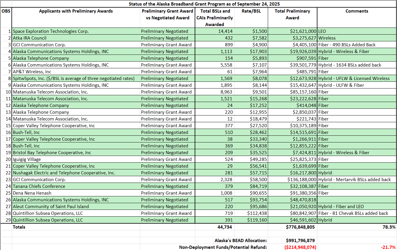 Alaska Broadband Office The Alaska Broadband Office (ABO) was created on August 9, 2022, when Governor Dunleavy signed Alaska House Bill 363 into law. The State of Alaska had been engaged in broadband work for several years, most recently highlighted through efforts of the Governor’s Task Force on Broadband in their Final Report issued in November of 2021. Formal broadband efforts were then transferred to the Commissioner’s Office in the Department of Commerce, Community and Economic Development. The Alaska Broadband Office oversees the State of Alaska's efforts to ensure all Alaskans have high quality, affordable internet. The Broadband Equity Access and Deployment (BEAD) Program, established under the Infrastructure Investment and Jobs Act (IIJA) passed by Congress in November 2021, allocate funds to expand broadband access for underserved and unserved communities in Alaska. Alaska Broadband Grant Program The Public Comment period for the Alaska Broadband Grant Program, Broadband Equity, Access, and Deployment (BEAD) Final Proposal is now closed. The ABO would like to thank everyone who took the time to submit comments. For convenience, the draft SOA Final Proposal Narrative, Appendices, and data files remain below. If there are any questions, please send them to ced.abo.general@alaska.gov. DRAFT - Alaska Broadband Grant Program Final Proposal Narrative DRAFT - SOA Final Proposal Narrative - Appendix A: BEAD Monitoring Procedure DRAFT - SOA Final Proposal Narrative - Appendix D: EHP Summary DRAFT - SOA Final Proposal Narrative - Appendix E: ABO PEIS Evaluation Memo DRAFT - SOA Final Proposal Narrative - Appendix F: FirstNet PEIS Sufficiency of the Proposed Action DRAFT - SOA Final Proposal - SUBGRANTEES (R1 09-24-25) DRAFT - SOA Final Proposal - DEPLOYMENT_PROJECTS (R2 09-25-25) DRAFT - SOA Final Proposal - Community Anchor Institutions (R1 09-24-25) DRAFT - SOA Final Proposal - LOCATIONS (R2a 09-25-25) DRAFT - SOA Final Proposal - No BEAD Location (R1 09-30-25)